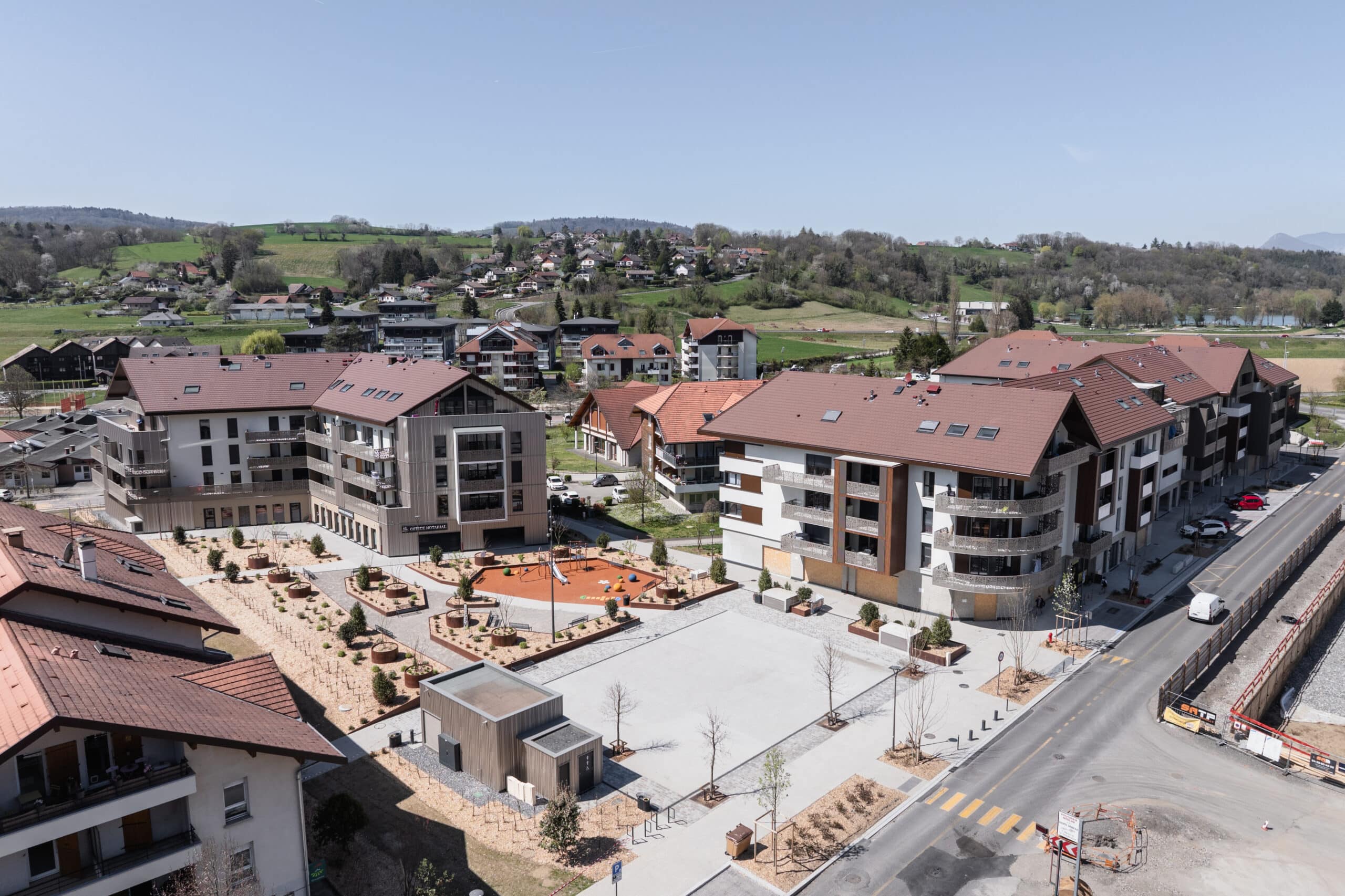 Ce nouveau quartier idéalement situé regroupe une centaine de logements ainsi que de nombreux commerces et bureaux qui viendront renforcer son dynamisme, et répondre à une demande croissante de services. Basée sur une conception en ilot aéré et végétalisé, la résidence a été imaginée autour d’une grande place centrale agrémentée d’arbres, de fontaines, de larges promenades piétonnes avec ses commerces en rez-de-chaussée.