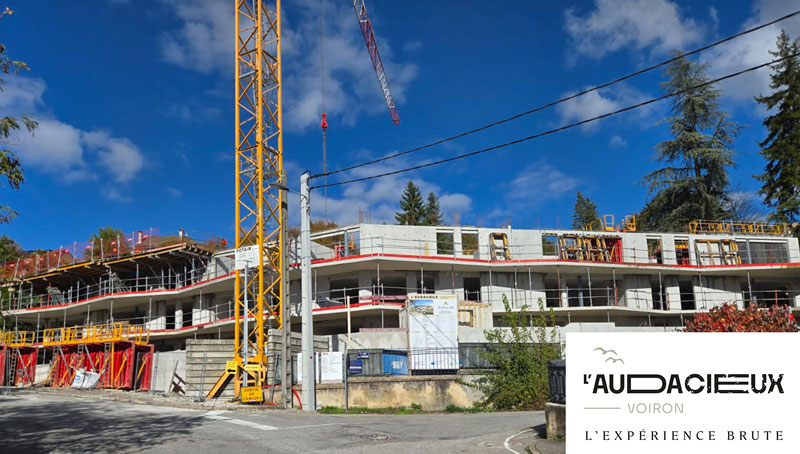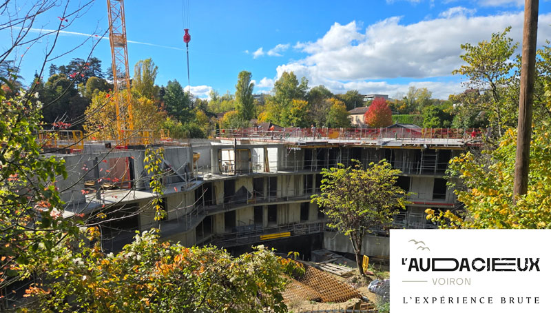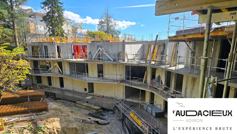 Il y a 30 jours, nous vous présentions les premières avancées du chantier de L’Audacieux. Aujourd’hui, la résidence dévoile encore plus son identité : les étages prennent forme et la silhouette contemporaine s’affirme dans ce quartier calme et verdoyant de Voiron.