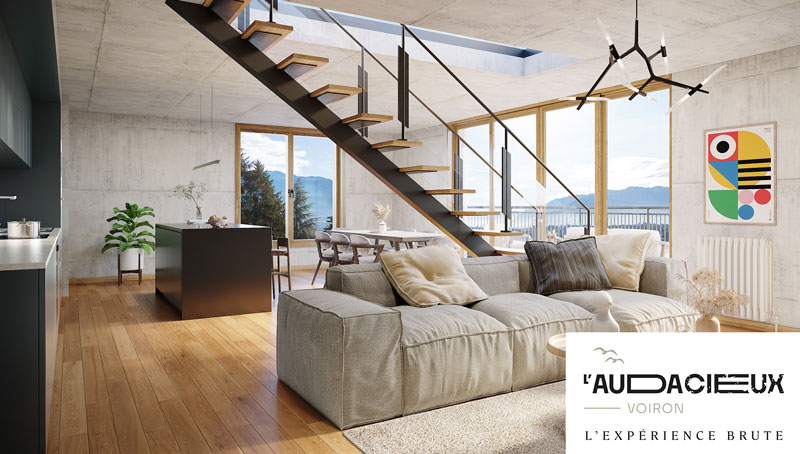 ✔ Pack LOFT : murs et plafonds en béton brut, touches de bois pour un style industriel chic.